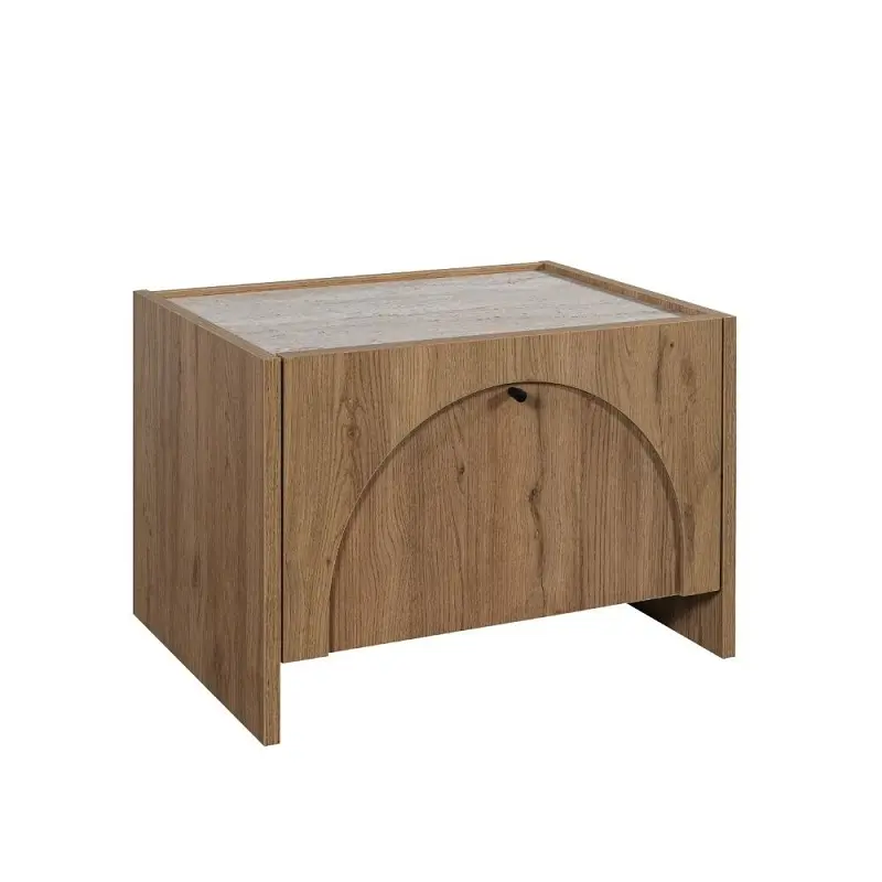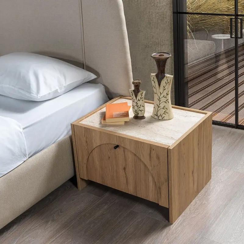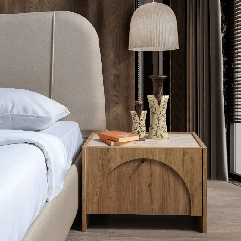 الكمودينة تضيف لمسة عملية بجانب السرير، مع سطح علوي مناسب لوضع المصباح أو الأغراض الشخصية اليومية. تصميمها يتناغم مع باقي قطع الطقم ويعزز من جمال المساحة.