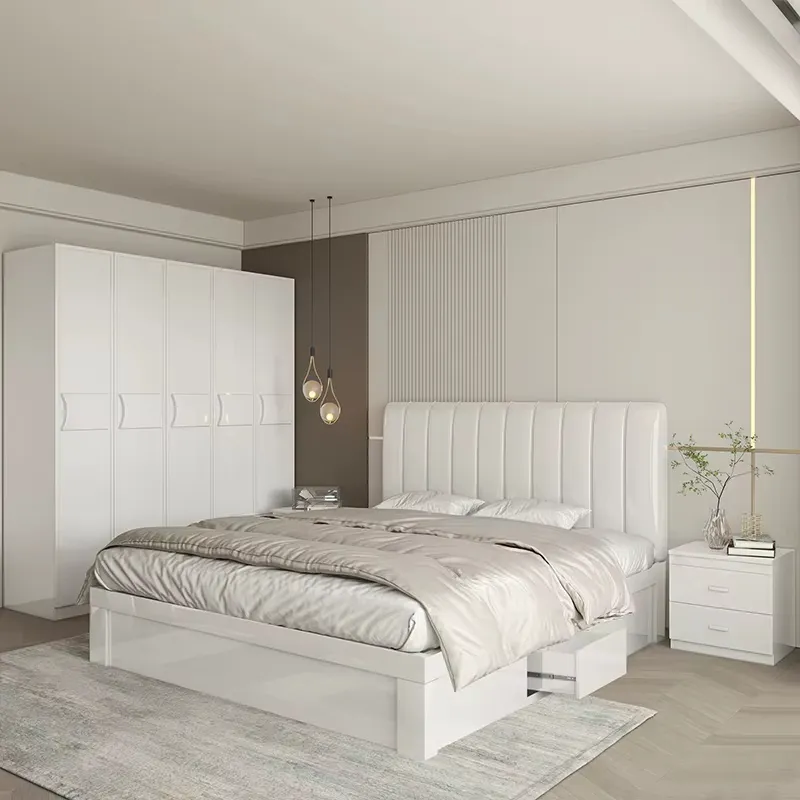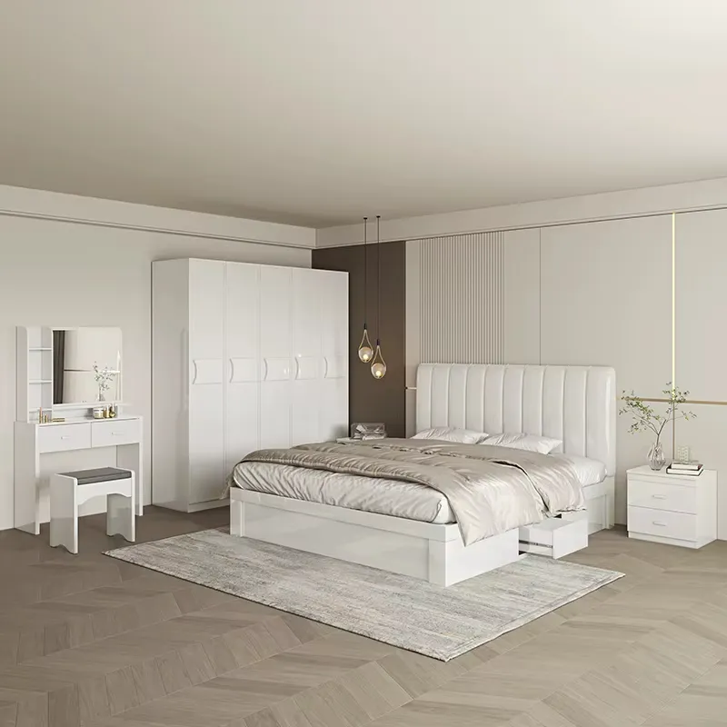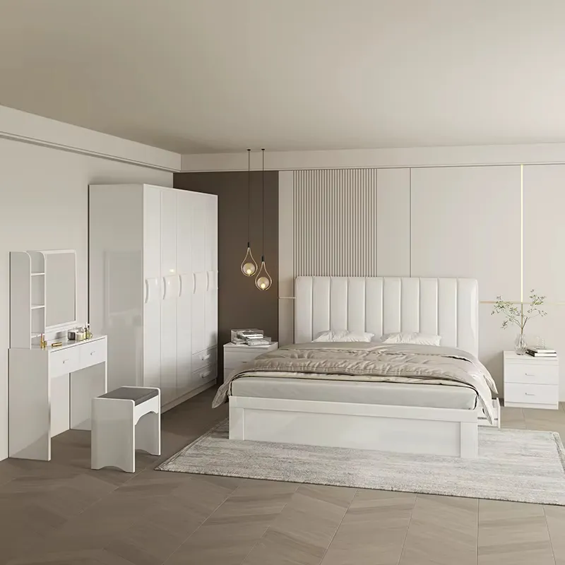 يتميز هذا الطقم بتصميم أوروبي أنيق يجمع بين التفاصيل البسيطة والخطوط الراقية، مما يجعله خيارًا مثاليًا لعشاق الأناقة العصرية. اللون الأبيض الهادئ يمنح الغرفة شعورًا بالاتساع والنقاء، مع لمسات دقيقة تضيف طابعًا راقيًا يناسب جميع الأذواق.