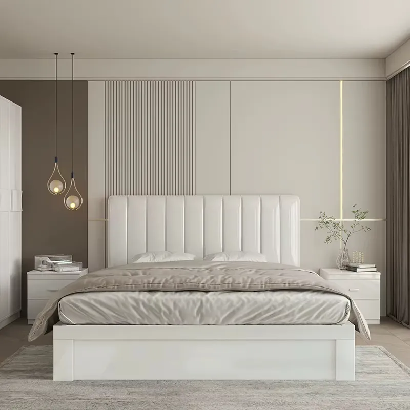 طقم غرفة نوم أوروبية أنيق من صوفا يجمع بين الفخامة العصرية والجودة العالية. مصنوع من خشب هندسي وخشب زان روماني متين، مع سرير مغطى بالجلد الإيطالي الفاخر المبطن بالإسفنج عالي الكثافة لتجربة نوم مريحة. يتميز بلونه الأبيض الهادئ الذي يضفي لمسة راقية على الغرفة، مع تصميم عملي وخامات تدوم طويلاً. ضمان سنتين ضد عيوب التصنيع في دول مجلس التعاون الخليجي