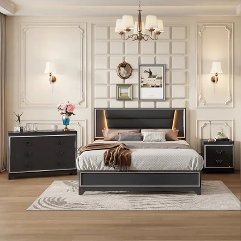 طقم غرفة نوم بتصميم أوروبي فاخر من متجر صوفا يجمع بين الأناقة والراحة بجودة عالية. مصنوع من خشب هندسي وخشب زان روماني متين مع لمسة جلد إيطالي لامع مبطن بالإسفنج عالي الكثافة. متوفر باللونين الأبيض والأسود ليناسب جميع الأذواق. يتميز بسهولة التنظيف وضمان لمدة سنتين ضد عيوب التصنيع،