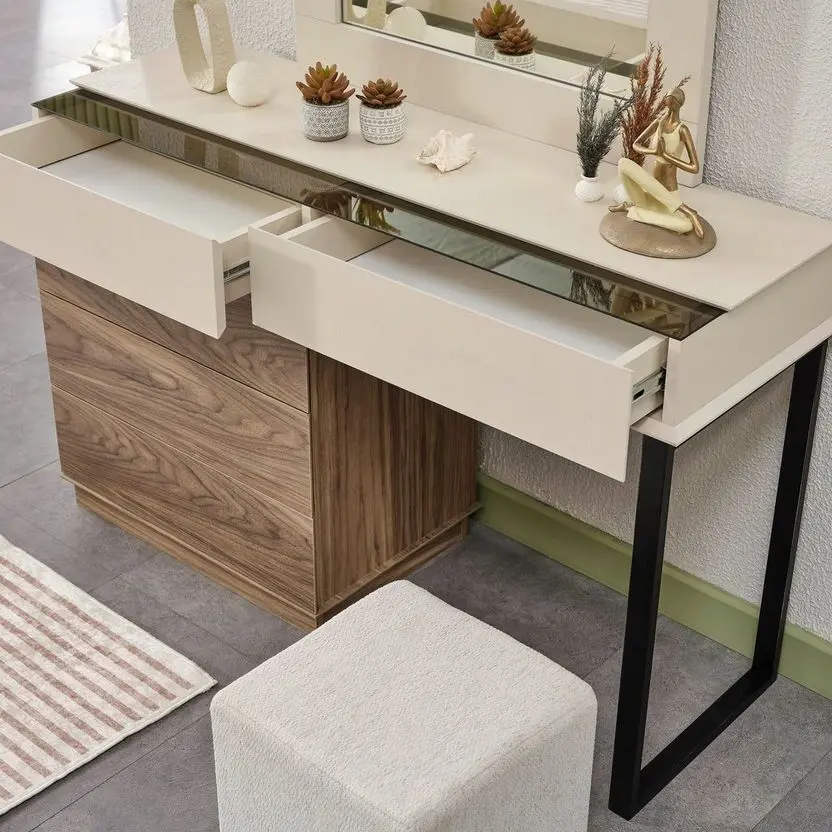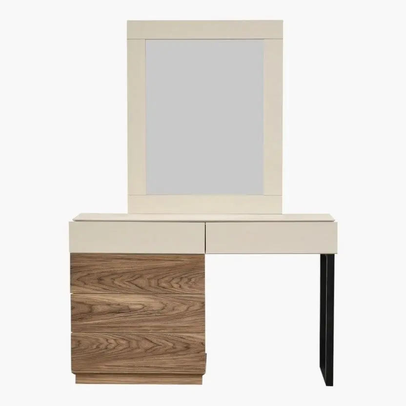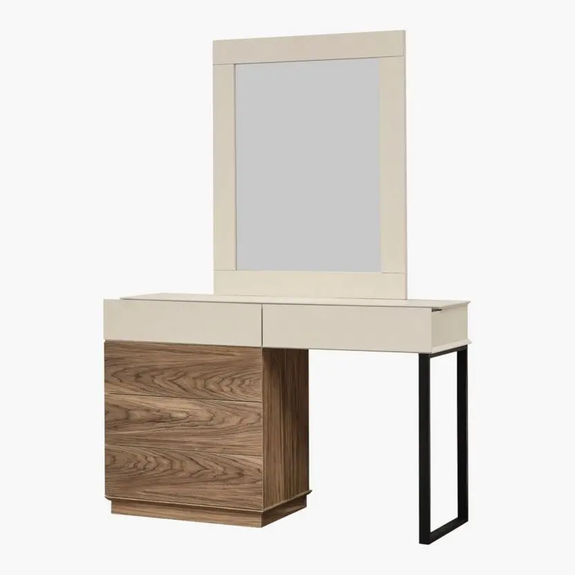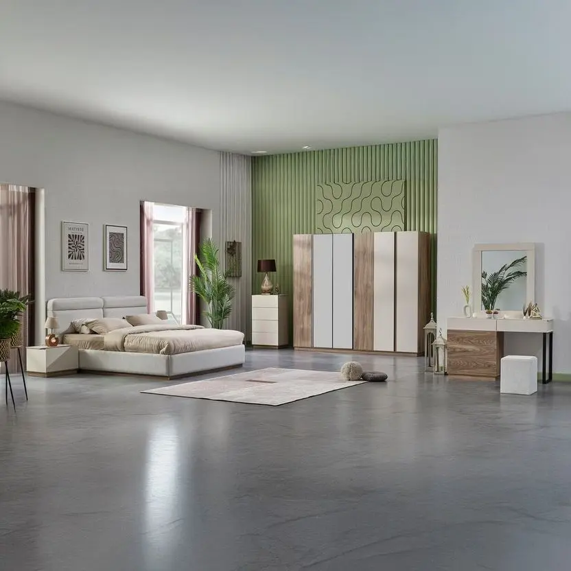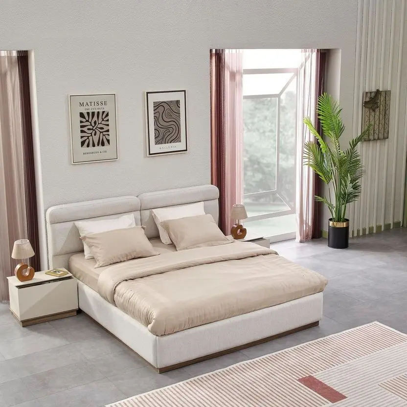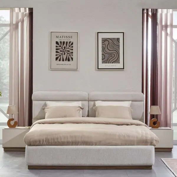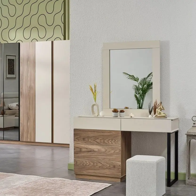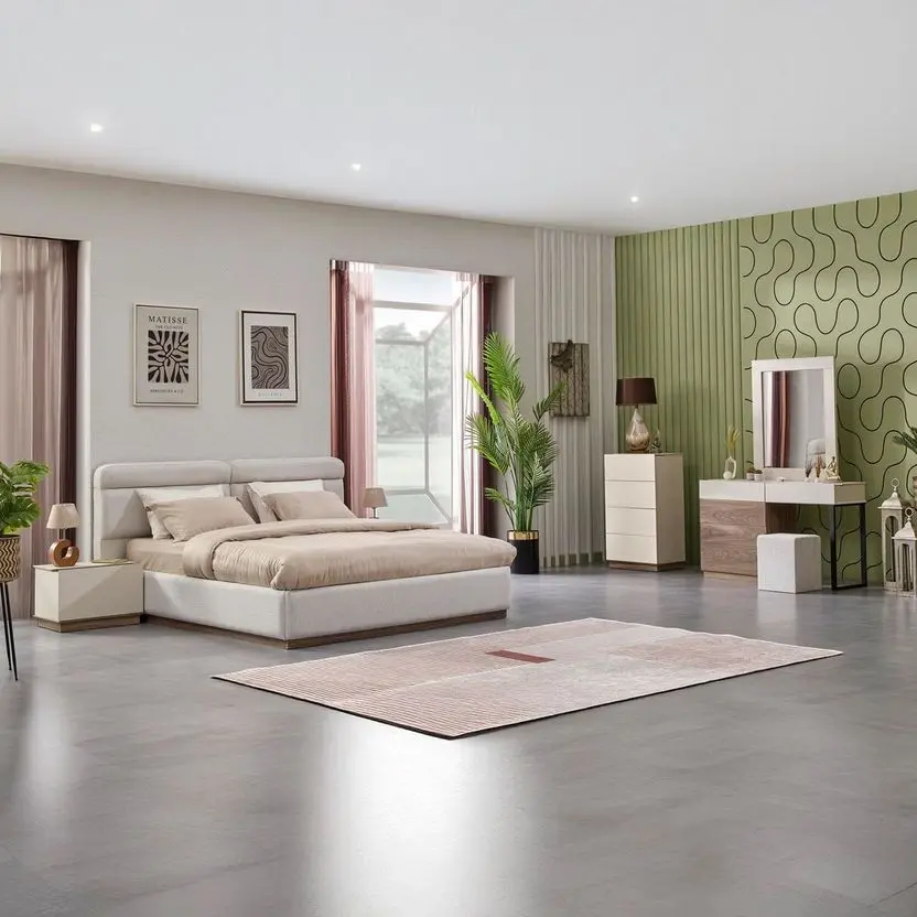 تصميم الطقم مستوحى من الخطوط البسيطة التي تمنح شعورًا بالاتساع والتنظيم داخل الغرفة، ما يجعله مناسبًا للمساحات الصغيرة والكبيرة على حد سواء. تم تصنيع الهيكل من خشب زان متين عالي الجودة، ليضمن لك قوة تحمل ممتازة وثباتًا طويل الأمد. ويعزز الطقم الإحساس بالراحة من خلال استخدام إسفنج عالي الكثافة في تنجيد الأجزاء الملامسة للجسم مثل ظهر السرير ومقعد التسريحة، مما يضيف لمسة ناعمة عند الاستخدام.