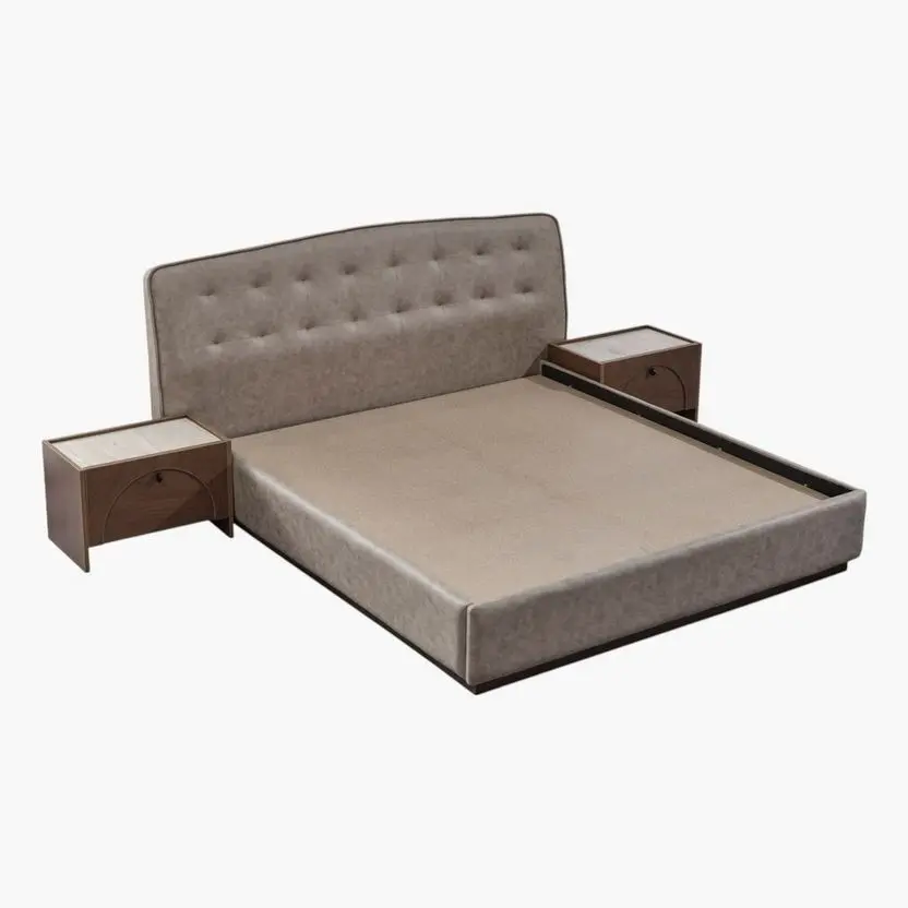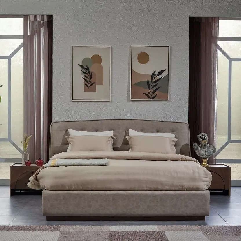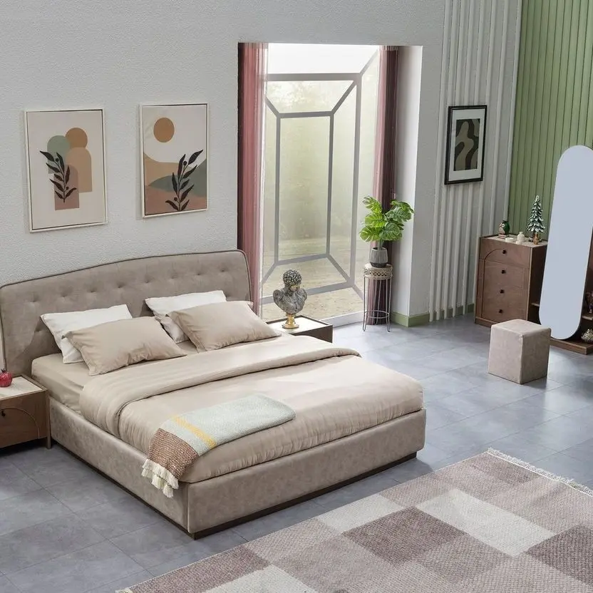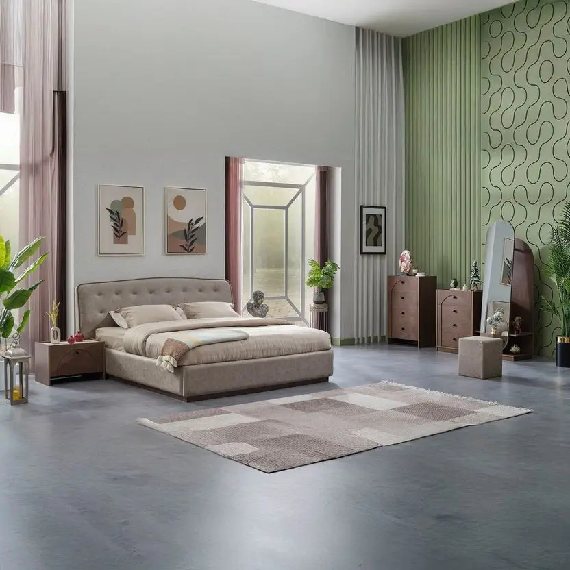 طقم غرفة نوم فخم بتصميم يجمع بين الراحة والفخامة، مصنوع من خشب زان متين عالي الجودة وقماش فاخر، مع خزانة واسعة وسرير كينج يمنحك تجربة نوم مريحة وأناقة تدوم لسنوات.