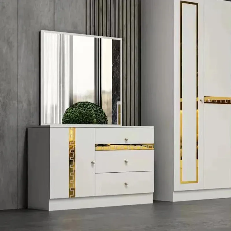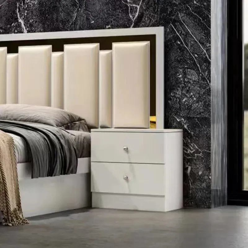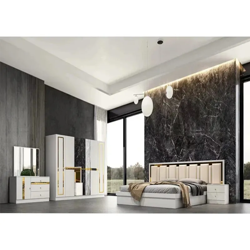 غرفة نوم فاخرة بتصميم عصري يجمع بين الأناقة والراحة، مصنوعة من خشب هندسي وزان روماني عالي الجودة مع لمسة ستيل مذهبة. السرير مغطى بجلد إيطالي فاخر مبطن بالإسفنج عالي الكثافة لتجربة نوم مريحة. تتضمن الغرفة سرير، خزانة، كومودينة، وتسريحة بألوان راقية وضمان سنتين ضد عيوب التصنيع في دول مجلس التعاون الخليجي