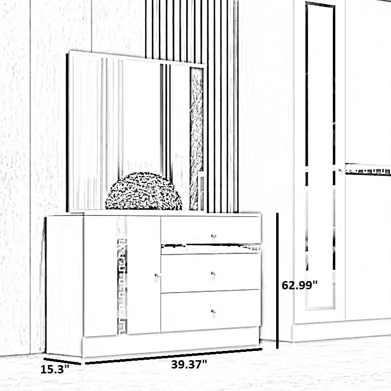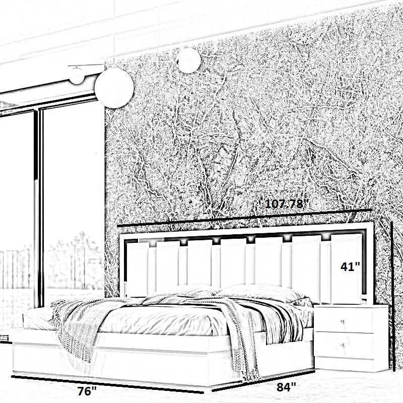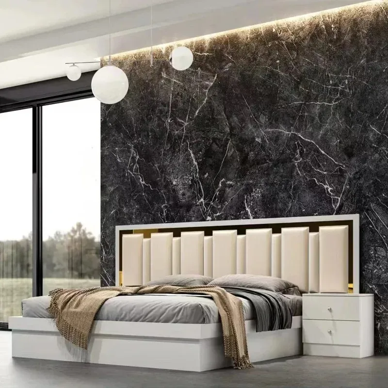 تعتمد الغرفة على هيكل متين من الخشب الهندسي وخشب الزان الروماني عالي الجودة المعروف بمتانته ومقاومته للاستخدام الطويل. تم تعزيز التصميم بلمسات من الستيل المذهب الصلب الذي يضفي مظهرًا فاخرًا، بينما يأتي السرير مغطى بالجلد الإيطالي الفاخر والمبطن بالإسفنج عالي الكثافة ليمنحك راحة استثنائية عند الاستلقاء.