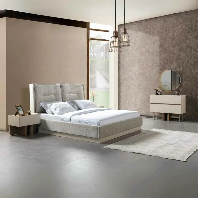 غرفة نوم متكاملة بخامات فاخرة، خشب زان متين، تنجيد فاخر، وتصميم يعكس الذوق الخليجي الرفيع. مثالية لمنازل المملكة ودول الخليج.
